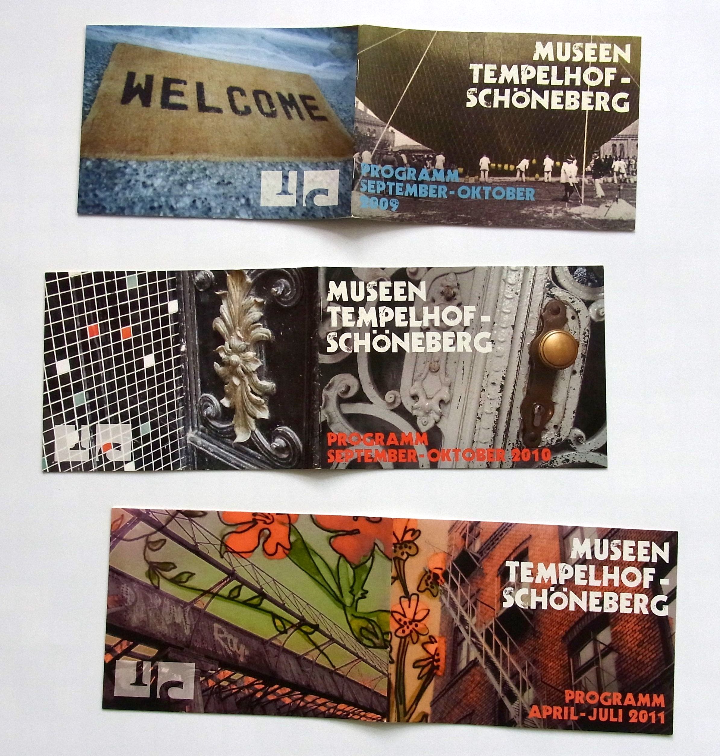 2008 erarbeiteten wir in Kooperation mit diegeisel eine neue Gestaltungslinie für Printprodukte der Museen Tempelhof-Schöneberg. Dazu gehörten Booklets mit Programmangeboten für Erwachsene. Das Format ist bei allen Heften DIN A6 quer. Die Umschlagseiten haben eine eher verspielte Anmutung, die Innenseiten mit den Veranstaltungshinweisen sind sehr grafisch gestaltet, ohne Abbildungen.